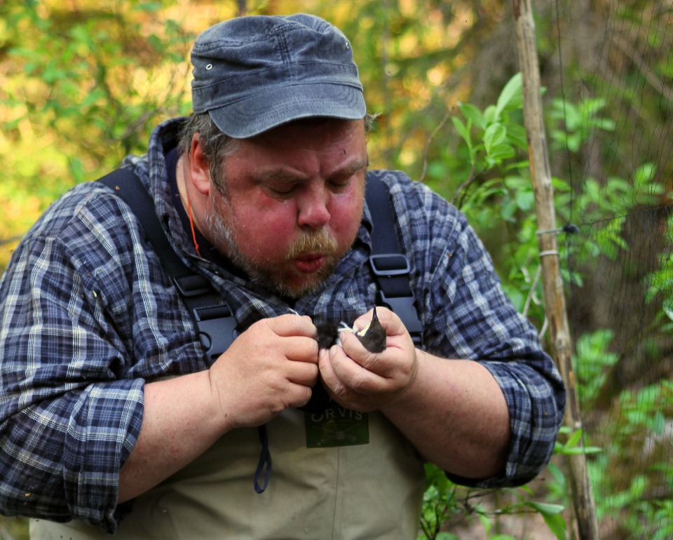 Aina toivotaan, että kuvissa olisi huumoria. Nyt sitä on niin paljon, että tuomaristo sovelsi hieman sääntöjäkin. Lintuja ei saisi pyydystetää kuvattavaksi. Tässä pääpaino on kuitenkin rengastajassa. Kuva paljastaa, että koskikarojen rengastaminen on hikistä puuhaa. Hyvä rohkea otos “pelitilanteesta”, rehellinen kuva. Usein ihmiskuvissa esiintyy unelmavävyjä ja sutjakoita neitejä. Nyt kohteena on suomalainen mies!
