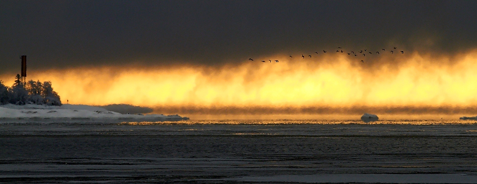 Hieno maisemallinen lintukuva, jossa tummat pilvet kontrastoituvat komeasti kullanväriseen valoon. Merestä nouseva väreily korostaa jäätyvän meren hohkaamaa kylmyyttä. Sommittelu ja rajaus toimivat hyvin.