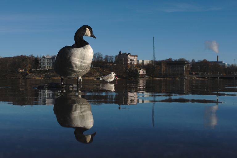 Hieno maisemallinen lintukuva matalasta kuvakulmasta upeine heijastuksineen. Lyhyellä objektiivilla kuvista tulee kolmiulotteisempia ja katsoja on ikään kuin enemmän kuvassa mukana.