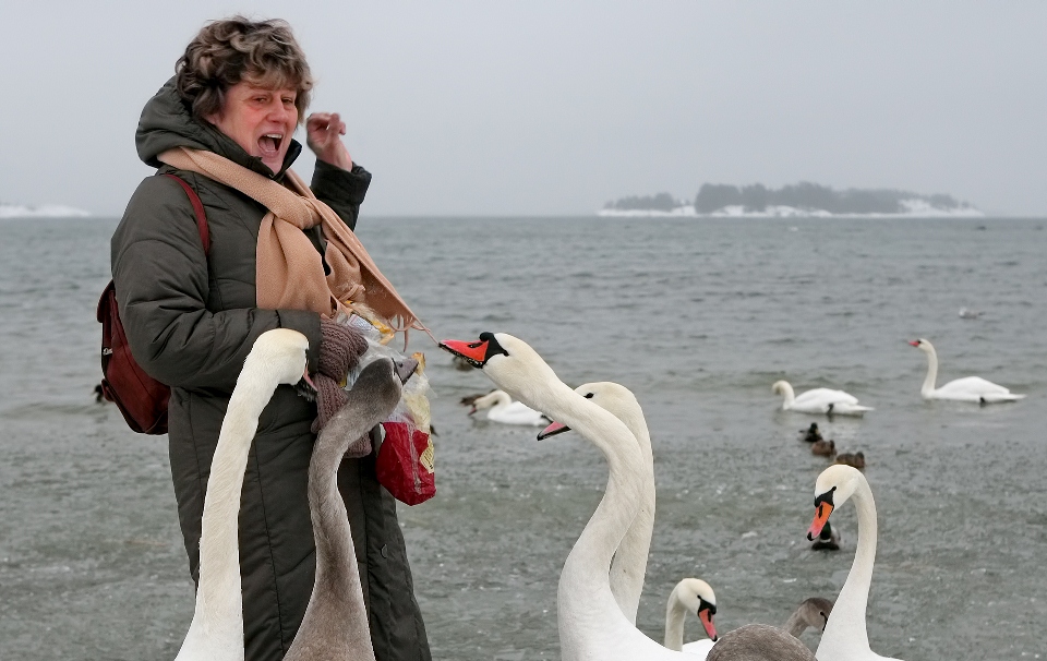 Hieno ”ihminen ja luonto” kategoriaan kuuluva kuva, jossa on mukana huumoria. Joutsenia ruokkivan naisen ilme tekee kuvasta onnistuneen. Kuvassa on hyvä sommittelu ja kuvaaja on ollut oikeassa paikassa oikeaan aikaan.