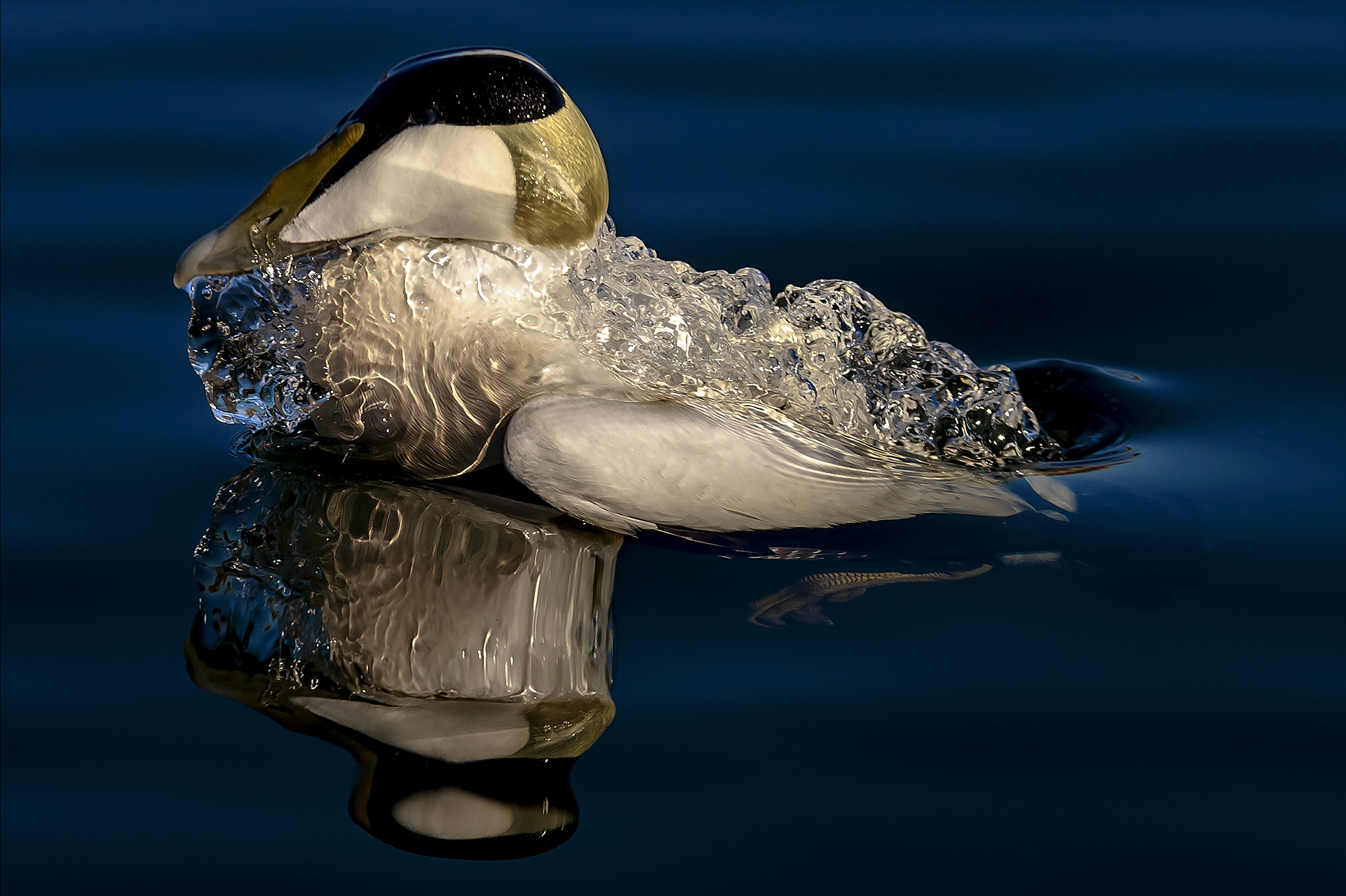 Haahka on yksi kuvatuimmista vesilinnuista, joten haahkakuvilla on vaikea säväyttää. Syvän värikkään ja hyvin toteutetun potretin tekee mielenkiintoiseksi haahkan selästä ja kaulalta valuva vesi. Kuva paljastaa ettei sukeltava lintu kastu. Tehokas kuva, joka kiinnittää heti katsojan huomion.