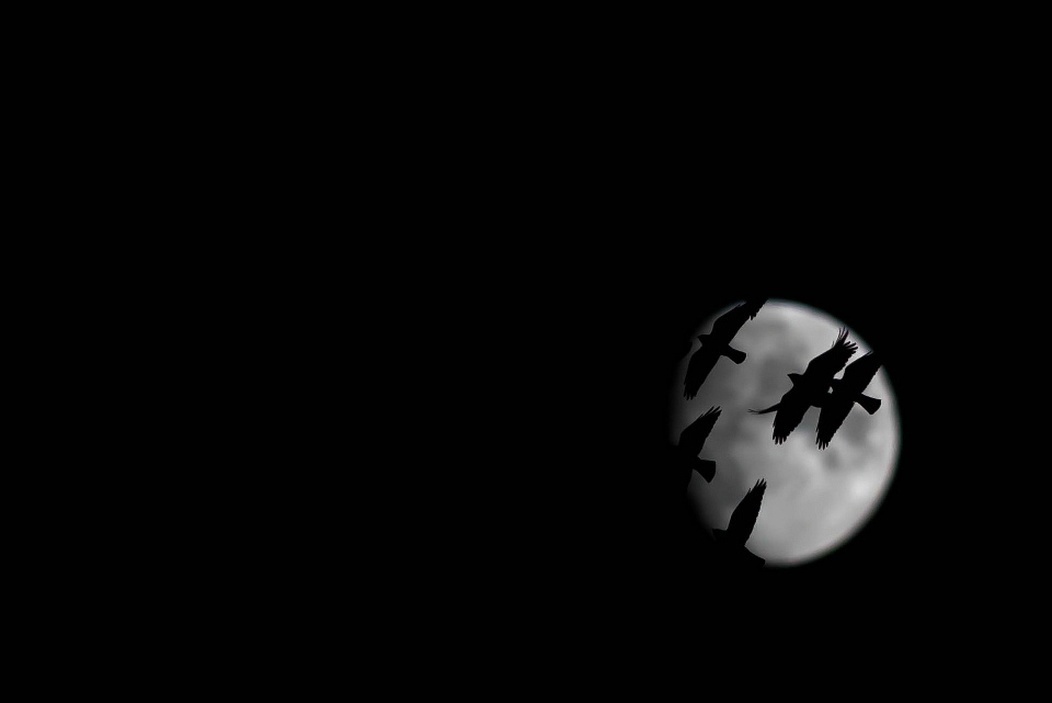 Erittäin hyvin toteutettu kuva. Ilmeisesti kuvaaja on käyttänyt alivalotusta ja saanut sillä kuvaan heti mustat sävyt, eikä kuu ole ylivalottunut. Kuutamoa vasten lentävät naakat ovat tarkkoja, rajaus on mielenkiintoinen. Naakat ovat nykyään taajamissa sen verran yleisiä, että jokainen lintuharrastaja on varmasti nähnyt niiden iltalennon. Mutta vaikka kohde on yleinen, naakkojen kuvaaminen kuutamoa vasten on haastavaa, suorastaan vaikeaa. Kuva olisi pärjännyt myös aikuisten sarjassa.