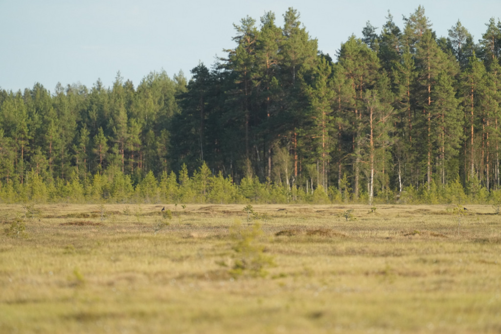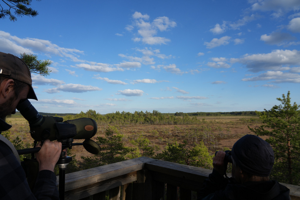 Tornissa alkoi tapahtua heti, kun sinne kiivettiin. Lähin sääksenpesä todettiin saman tien asutuksi, kiurut lauloivat ja punajalkaviklot ja kuovit huutelivat. Suolta nousi myös toivelistalla ollut mustapyrstökuiri – vain hävitäkseen saman tien jonnekin tuloreittimme suuntaan… Näitä sattuu, ja siksi suunnitelmana oli jälleen viettää tornissa runsaasti aikaa. Ja kuten aina, havaintoa alkoi kertyä vähitellen lisää ja lisää. Jostain kauempaa suon takaa löytyi kaarteleva iso petolintu, joka paljastui mehiläishaukaksi. Jossain kohtaa samaksi tulkittu lintua nuotitettiin lähempää, mutta lintu osoittautuikin hiirihaukaksi. Neljäs tornista havaittu petolintulaji, tuulihaukka, löytyi metsänreuna päivystäjien toimesta. Sääksiä oli paikalla ainakin kolme, ja päästiinpä lähipesän osalta todistamaan myös sisustuspalaveria: toinen osapuoli kantoi paikalle hervottoman oksan, joka lopulta kelpasi myös valmiiksi komean risulinnan osaksi.
