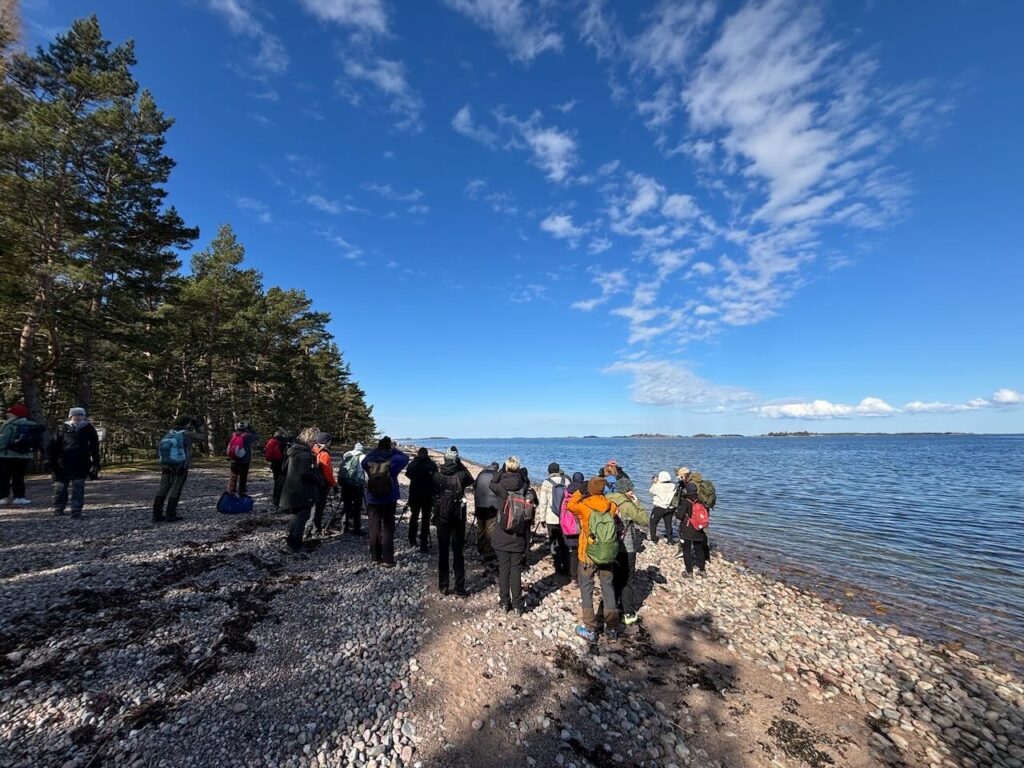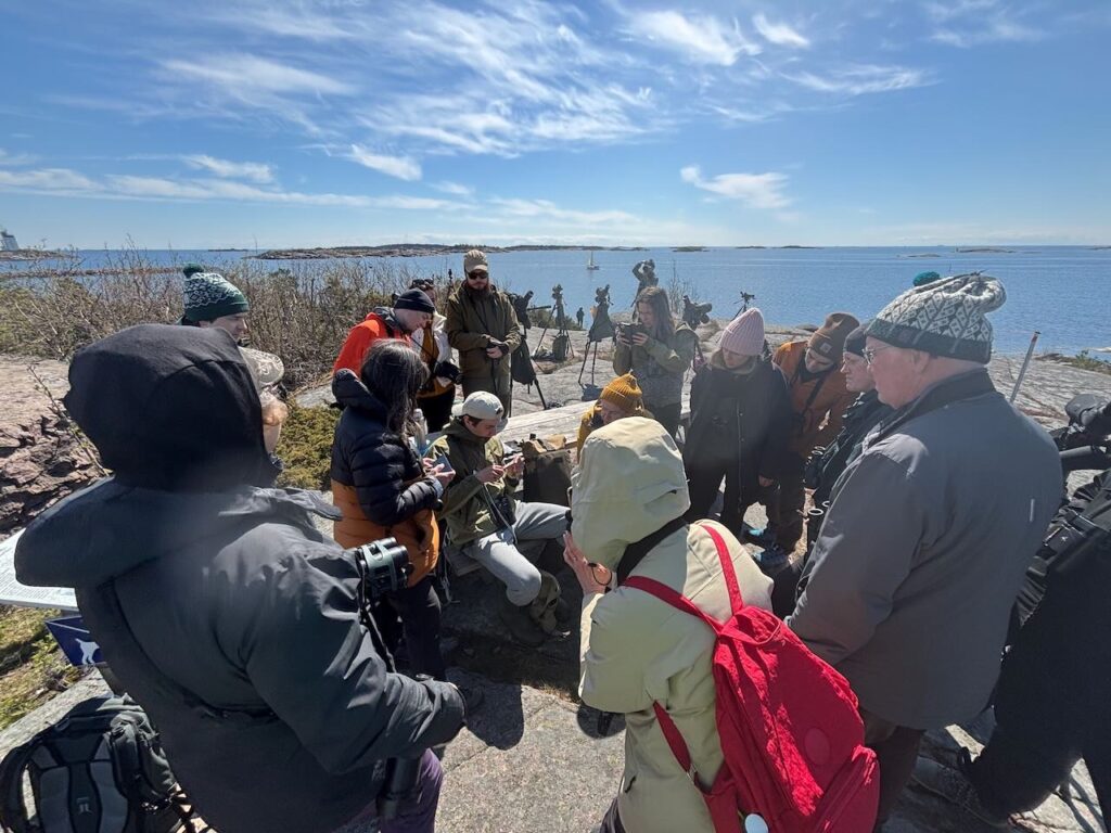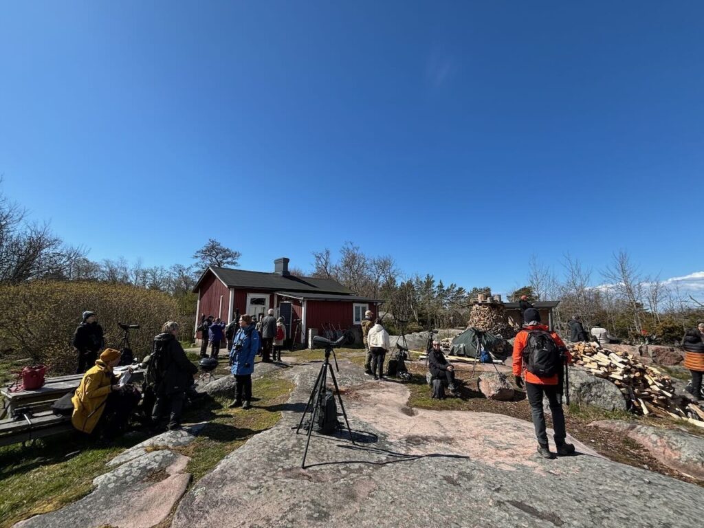 Lintuaseman pihassa Juho kertoi lintuaseman toiminnasta ja sen tärkeästä tehtävästä linnustonseurannassa. Samassa asemalla rengastajana ollut Olli palasi verkkokierrokseltaan tyhjin käsin, mutta lupasi tulla näyttämään retkeläisille myöhemmin, jos verkoista tulisi rengastettavaa. Aseman pihan yllä lenteli muutamia hemppoja, kauempaa kierteli pari vanhaa merikotkaa ja lähiluodolla näkyi pienen hetken kaksi keltavästäräkkiä, jotka jäivät vain Tuomaksen havaitsemiksi.