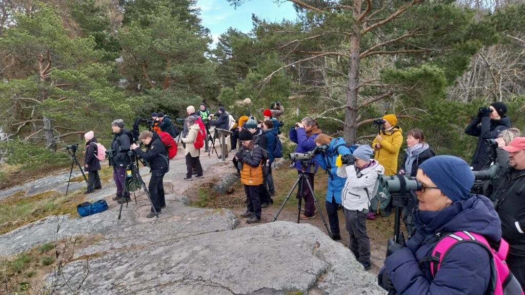 Muutto oli tosiaan vaimeaa koko kalliolla viettämämme noin 2,5 tunnin ajan. Heti aluksi löytyi melko kaukaa lounaispuolelta luotojen takana lentänyt tumma merikihu, joka jäi retken ainoaksi lajihavainnoksi. Bunkkerilla päivystänyt Aleksi Mikola ilmoitteli Juholle radiopuhelimella havaitsemiaan lintuja. Retkihavainnoiksi kertyi kaukaa luoteispuolelta lensi yksi hiirihaukka, muutamia varpushaukkoja, itäpuolelta hieman lähempää, mutta kovassa väreilyssä yksi piekana. Lisäksi havaittiin mm. muutama punakuiriparvi, yksittäinen muuttava pikkukuovi, yksi valkoposkihanhiparvi sekä jonkin verran paikallisia haahkoja ja muita vesilintuja meressä. Rengastaja Olli toi kalliolle rengastusverkkoon lentäneen pajulinnun ja kertoi lintujen rengastuksesta. Hän selitti rengastuksen eri vaiheet rengastaessaan linnun. Useampi retkeläinen kertoi mielenkiinnostaan osallistua rengastamiseen tulevaisuudessa.