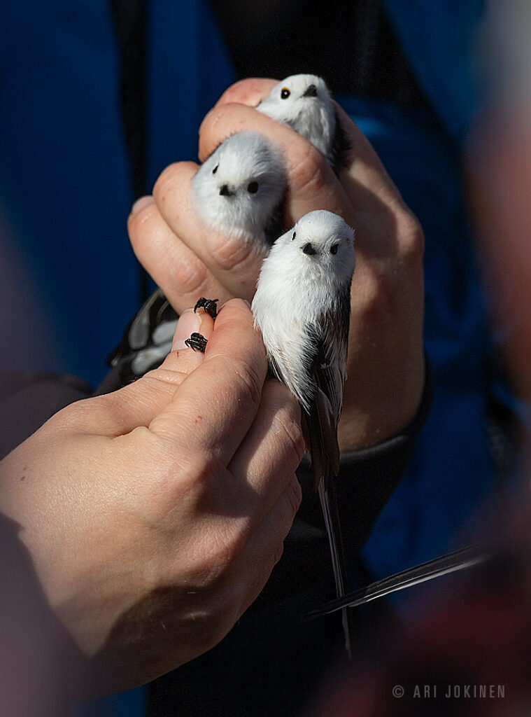 Aseman rengastaja Kimi Nurminen toi muutamia lintulajeja porukan ihailtavaksi. Rautiainen, sinitiainen, kuusitiainen ja monelle varmaan retken kohokohtana pyrstötiainen, tai itse asiassa kymmenkunta sellaista! Kaikki halukkaat saivat ottaa kuvia linnuista oppaiden käsissä ja muutama innokas pääsi vapauttamaankin lintuja kuvien oton jälkeen.
