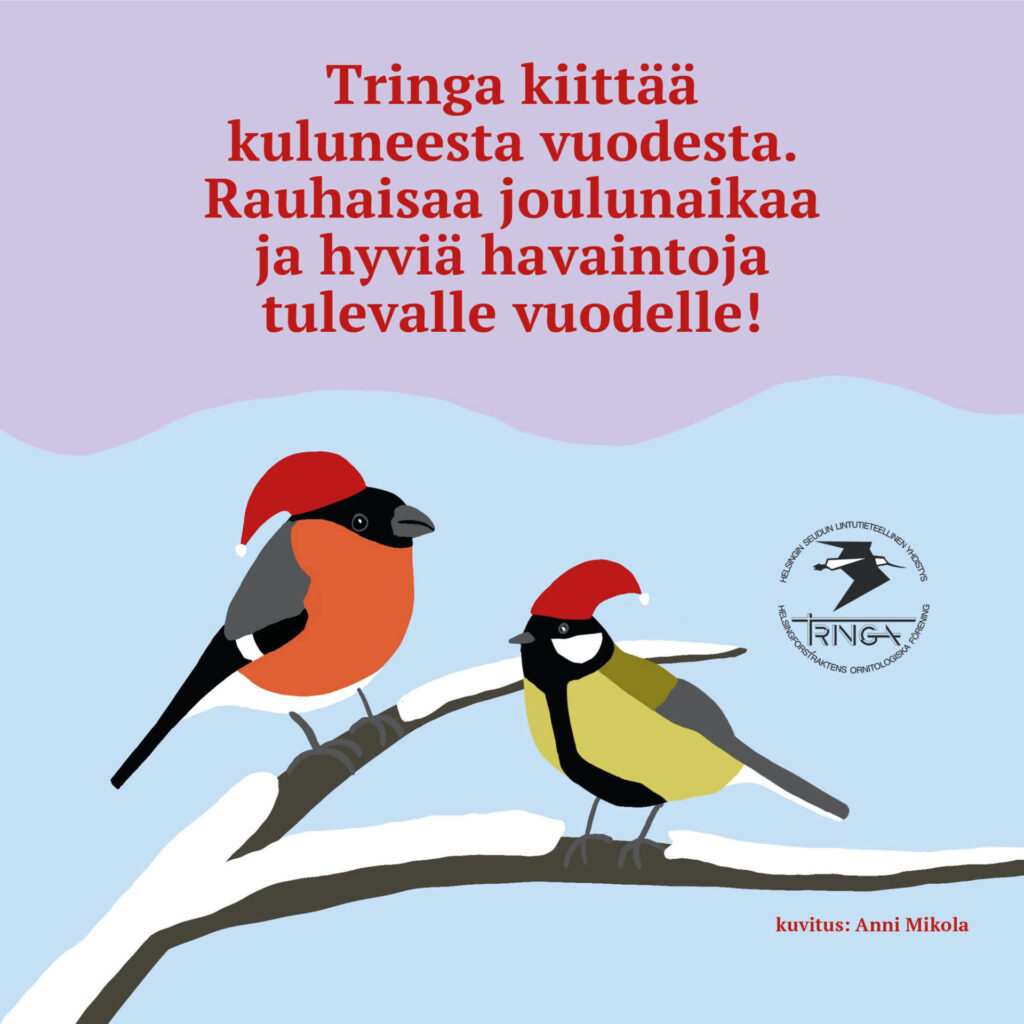 Tringan vuosi 2026 käynnistyy loppiaisen jälkeen: Yhdistyksen hallituksen järjestäytymiskokous pidetään torstaina 8. tammikuuta. Tapahtumavuoden avaa tammikuun lintuilta 15.1. ja retkikausi käynnistyy 17.1. retkellä Suomenlinnaan. Alkuvuoden tapahtumatiedot löydät Tringan tapahtumakalenterista.