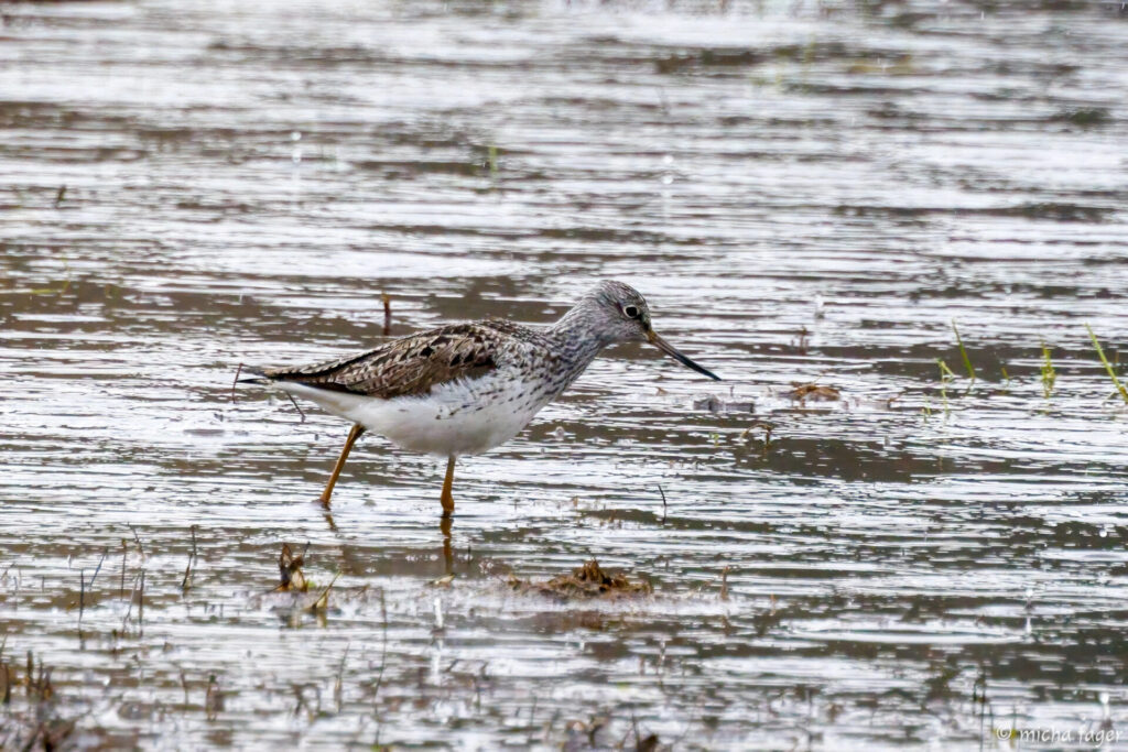 Tringan tunnuslintu valkoviklo Tringa nebularia levähtämässä ja ruokailemassa kevätmuutollaan. Kuva © Micha Fager