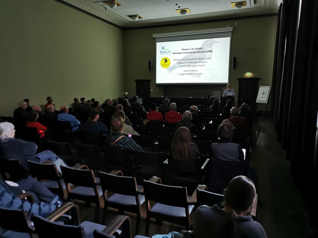 Sääntömääräisen kevätkokouksen jälkeen vuorossa oli huhtikuun lintuilta, jossa kuultiin, minkälaista Helsingin luonto, linnusto ja lintuharrastus olivat noin kaksisataa vuotta sitten. Lintuillan esitelmästä “Millaista oli pääkaupungin luonto, lintuharrastus ja lintuharrastajien elämä 1800-luvulla?” vastasi lintuharrastaja Magnus von Wrightistä kirjan kirjoittanut Jukka Hintikka.