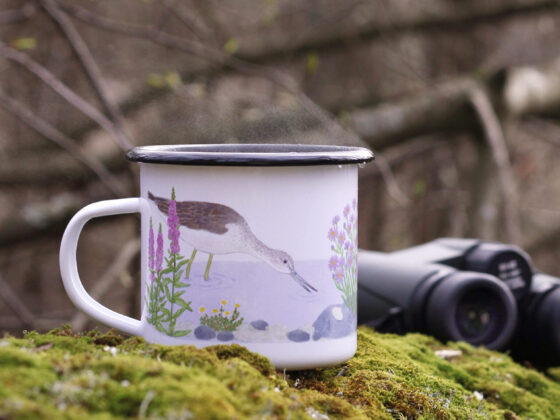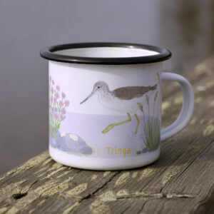 Tringan emalimukin kuvituksessa kesäisessä rantamaisemassa seikkailee Tringan tunnuslintu, valkoviklo. Mukin ympäri kiertävän kuvituksen on Tringalle suunnittelut luontoaiheisiin erikoistunut kuvittaja ja taiteilija Kaisa-Maria Laiho. Muki on kestävä ja kevyt ottaa mukaan linturetkelle. Käsinpesu pidentää emaliastioiden käyttöikää. Mukit on painettu Helsingissä. Jäsenhinta: 20€/kpl.